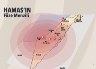Yukarıdaki infografik'te Hamas’ın sürekli roket atışlarını maruz kalan İsrail topraklarında roket menzilerini göstermektedir. Bu infografik "Hamas'ın roket...