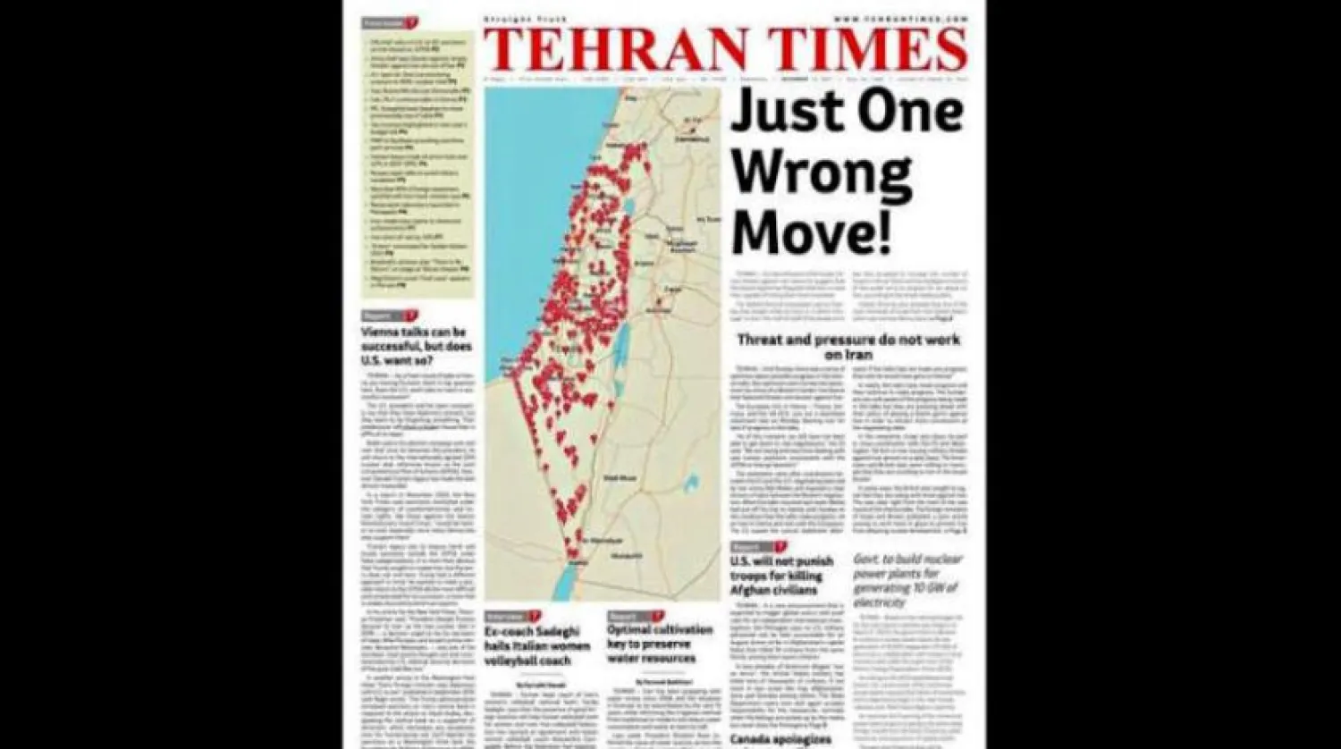 İran’ın İngilizce olarak yayınladığı Tahran Times’ gazetesi İran’ın bombalayabileceğini söylediği yüzlerce İsrail bölgesinin yer aldığı bir harita yayınladı. Harita İsrail’de küçümseme ve alayla karşılandı, çünkü bölgeler arasında Gazze Şeridi’ndeki Filistin kasabaları ve Filistin Yönetimi’nin Batı Şeria’daki toprakları da bulunuyor.